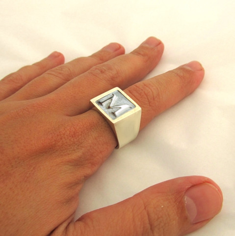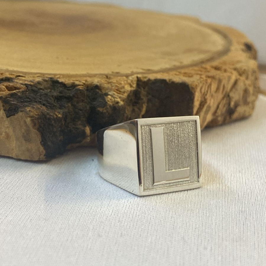 A letra de sua escolha é precisamente esculpida em alto-relevo sobre a face do anel, com um fundo de baixo-relevo escurecido que cria um contraste sofisticado e destaca o seu monograma. O design quadrado e imponente faz desta peça uma dedeira de presença marcante e estilo atemporal.