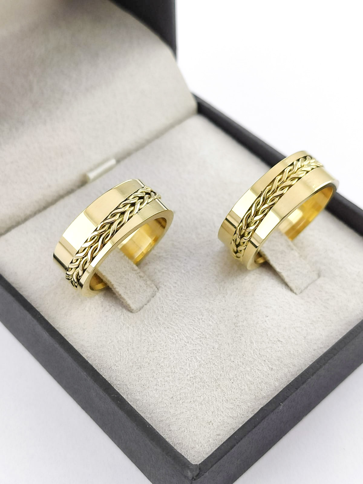 A força de um amor entrelaçado. Estas alianças largas e côncavas oferecem um conforto excepcional e uma presença marcante. A opção de trança simboliza a união inextricável de duas vidas, tornando-as não apenas um símbolo de compromisso, mas uma verdadeira obra de arte em ouro.