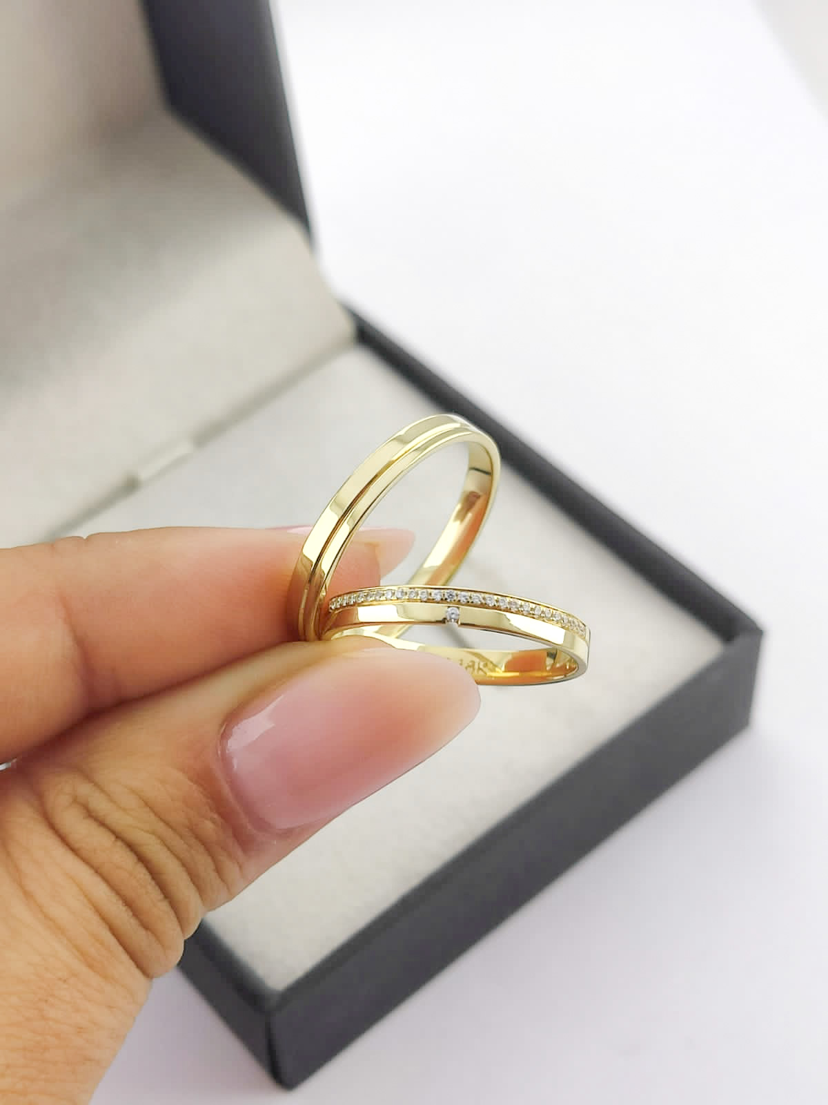 - Cravação: Granito, 15 pedras + Flutuante, 1 pedra na aliança feminina
