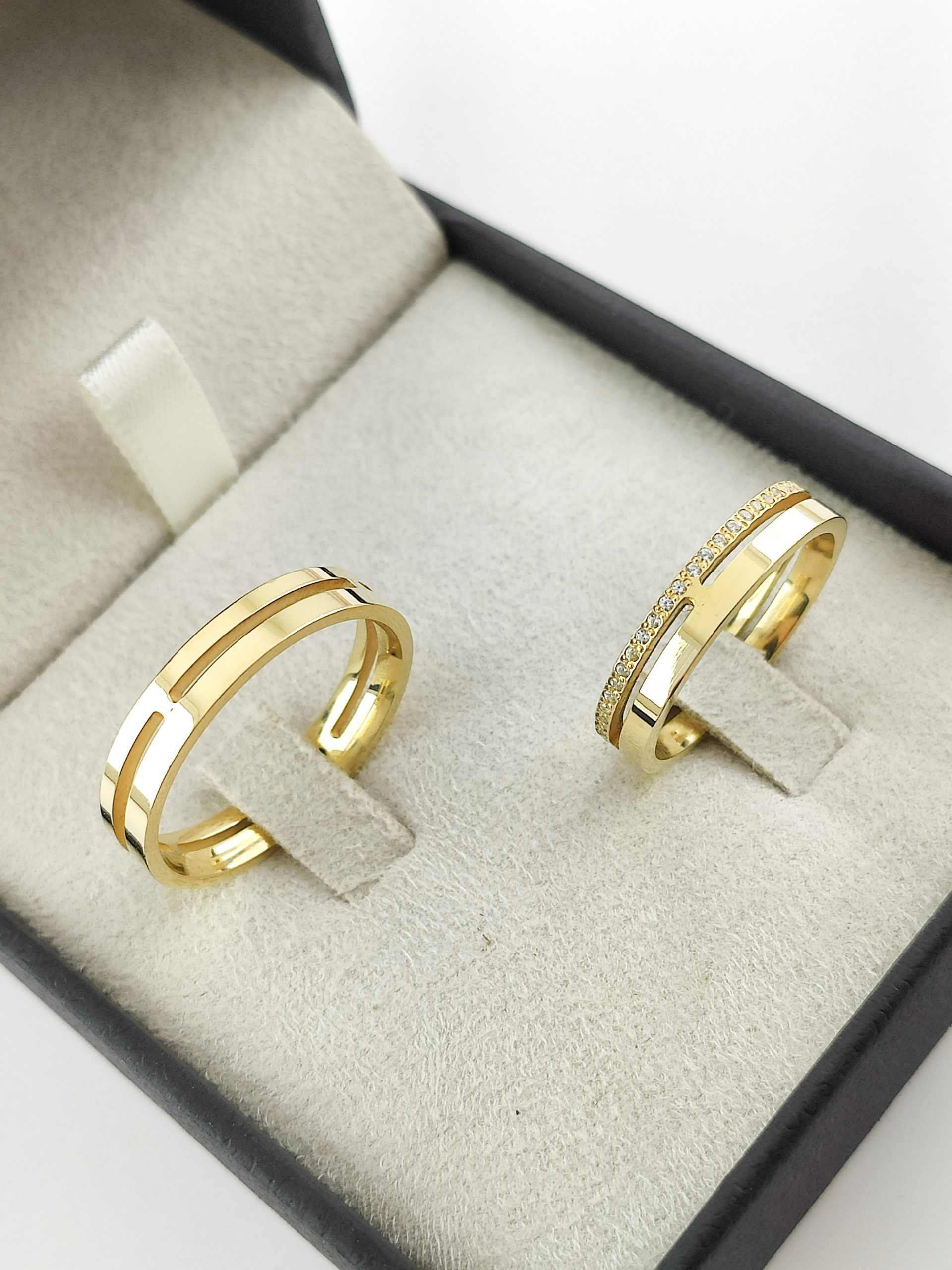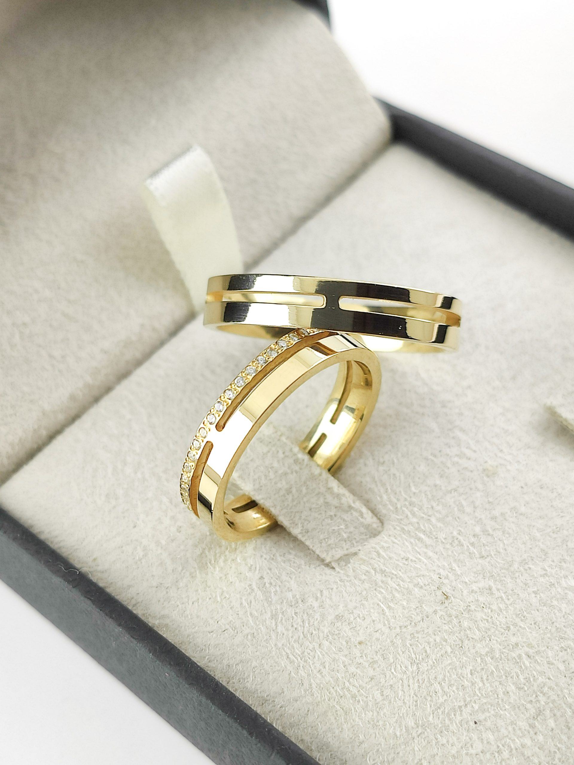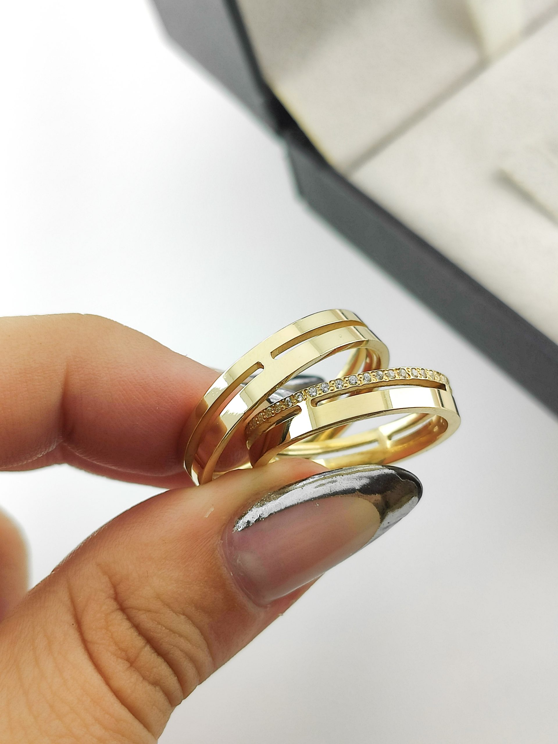 - Cravação: Granito, aprox. 45 pedras na aliança feminina