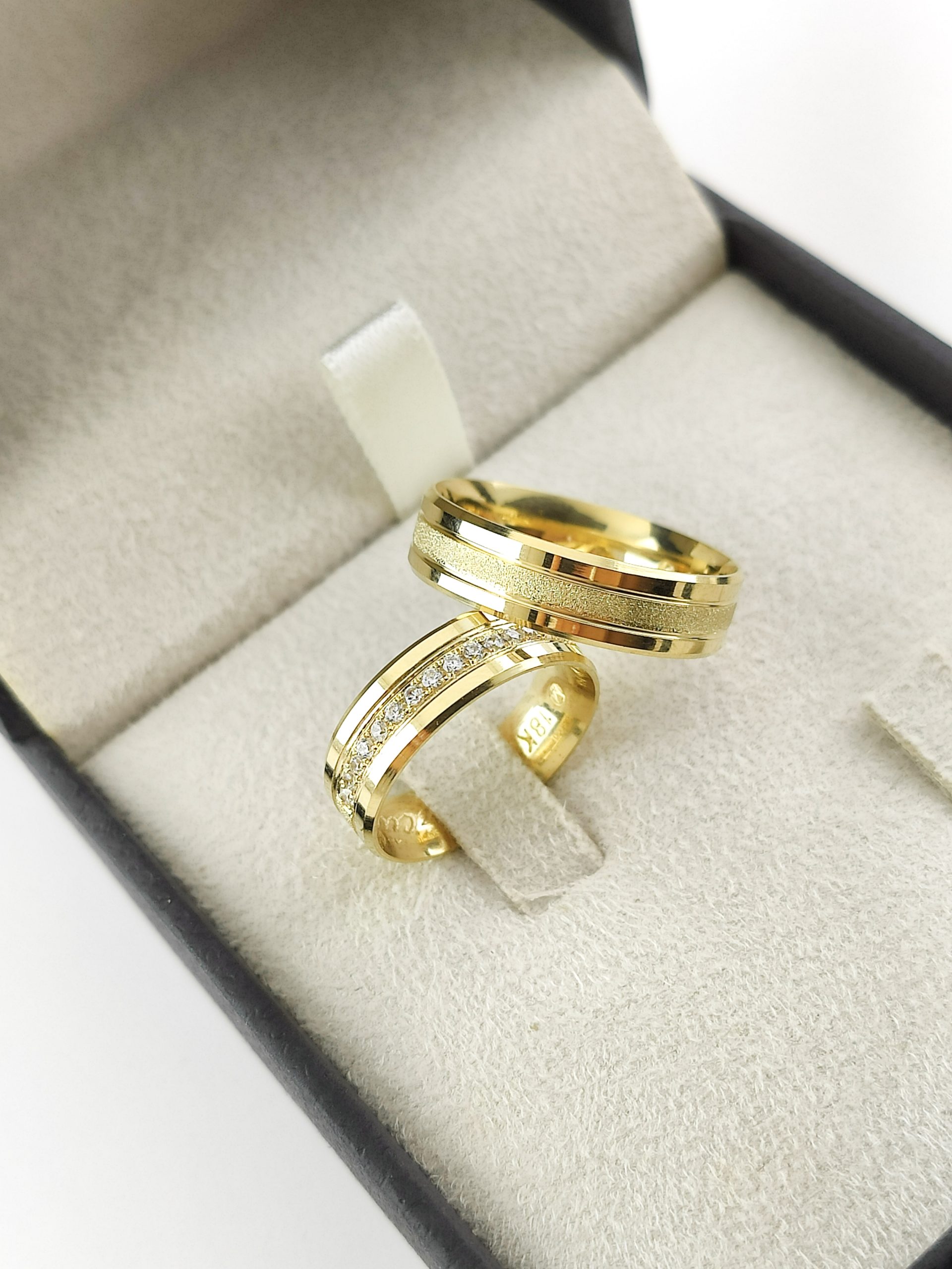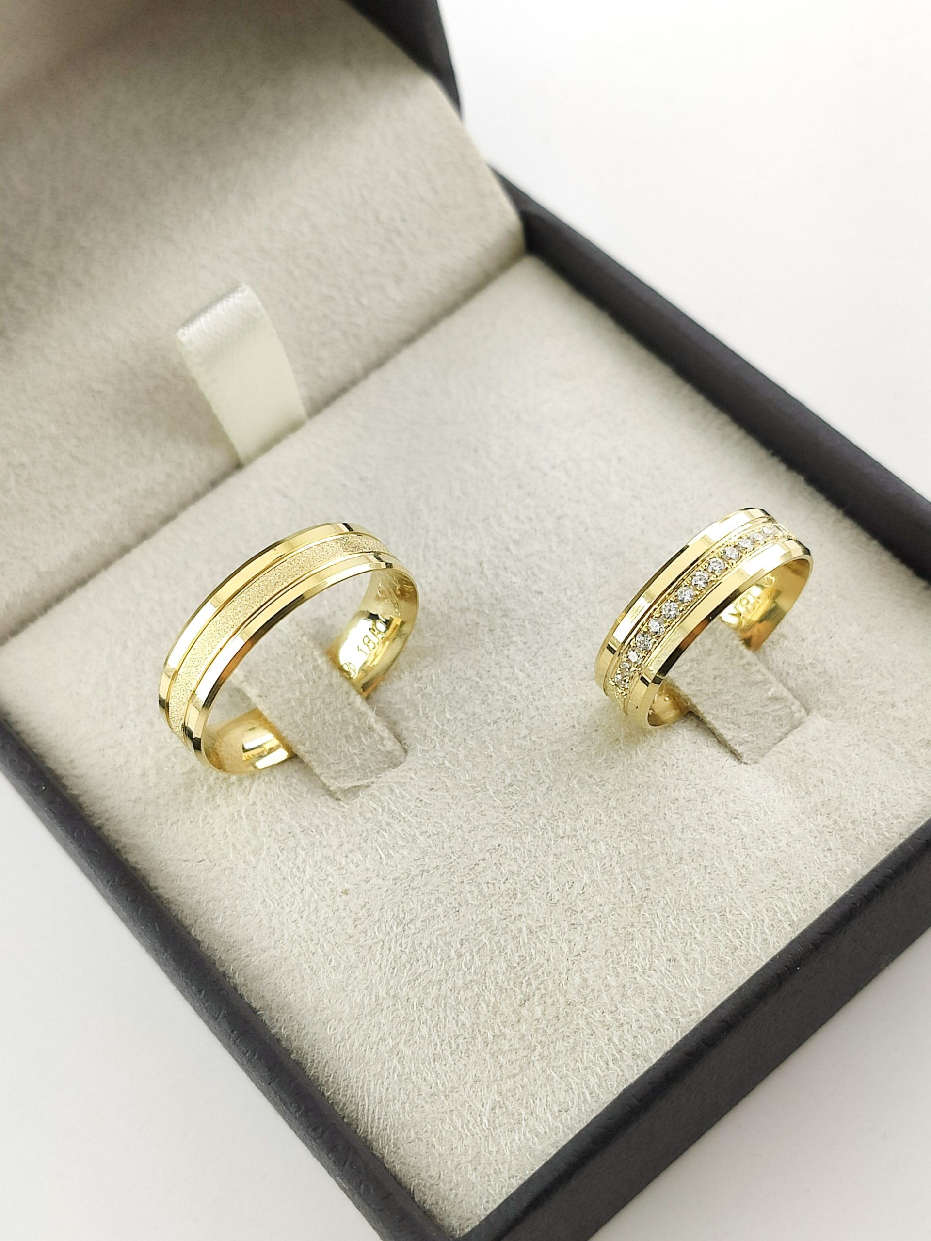 Par de Alianças Retas em Ouro 18k 5mm com Textura e Brilhantes