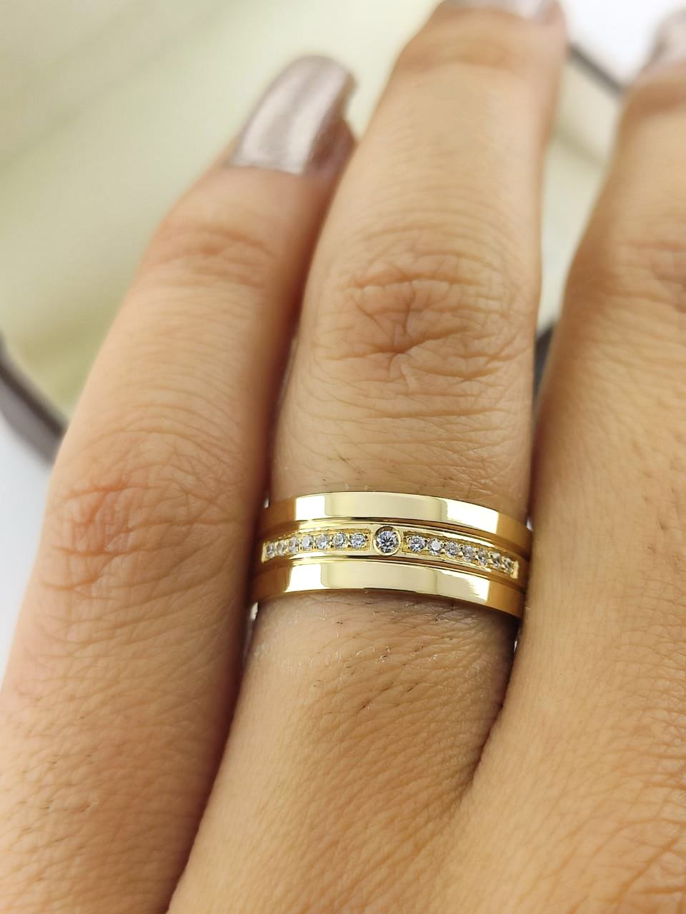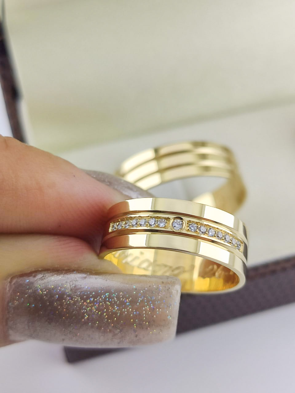 - Cravação: Granito, 14 pedras + Bigodinho, 1 pedra na aliança feminina