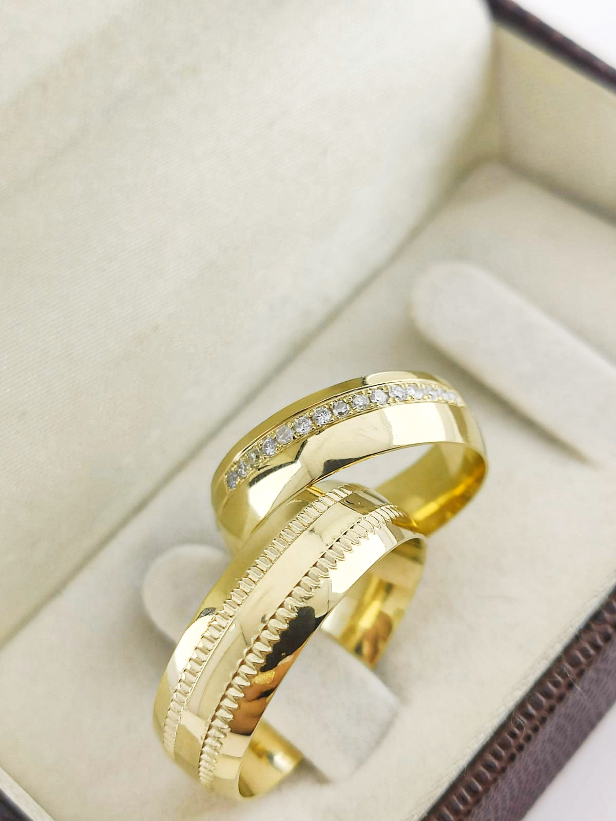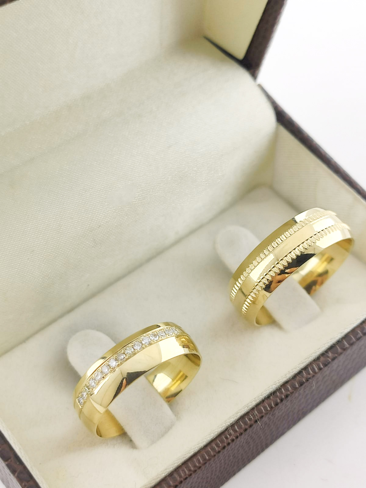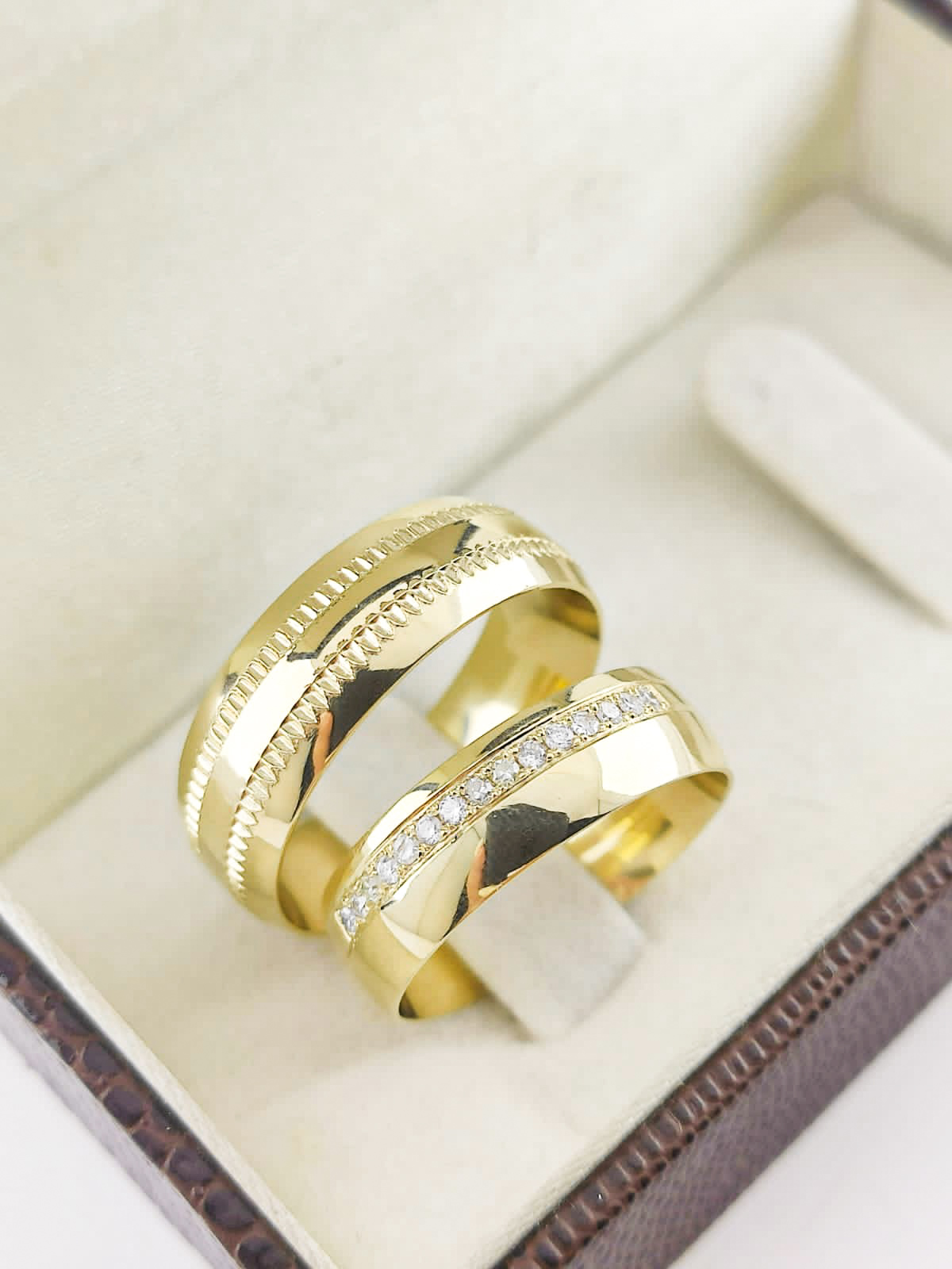 A beleza da complementaridade. A diferença de larguras (6mm e 7mm) simboliza como duas individualidades distintas se completam perfeitamente. O detalhe recartilhado e os brilhantes acrescentam camadas de significado e beleza.